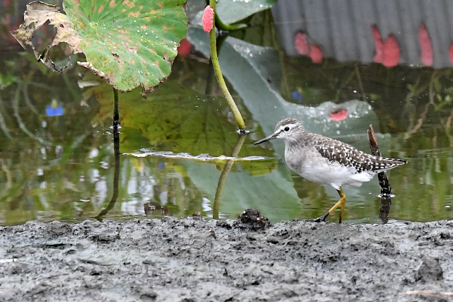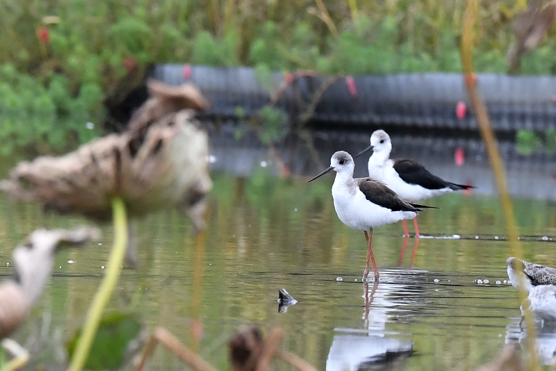 1枚の蓮田にオグロシギ、コアオアシシギ、ツルシギ、オオハシシギ、セイタカシギが集まっていました。半分身を隠して待っていると、ツルシギやコアオアシシギが採餌に集中して、どんどん近づいてきました。