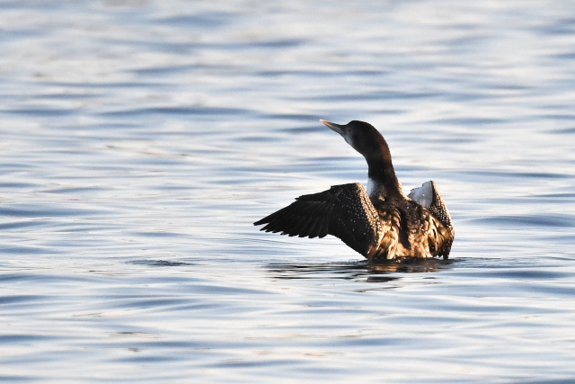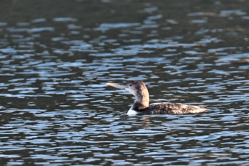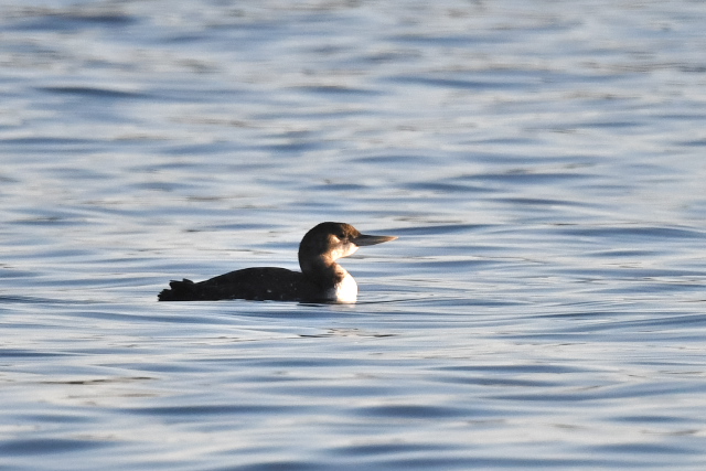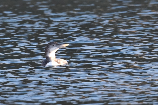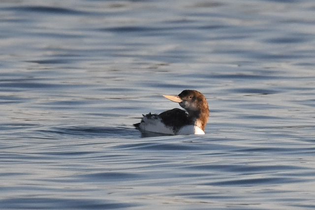 花咲港で初見のハシジロアビに出会いました。数年前の千葉で残念な思いをしていたので、うれしい出会いでした。 少し離れたところでときどき潜っていました。潜ると離れたところに現れるので、目の前に現れることを期待しましたが、思いは通じなかったようです。そのうち羽繕いを始め、「ぱたぱた」をして眠ってしまいました。