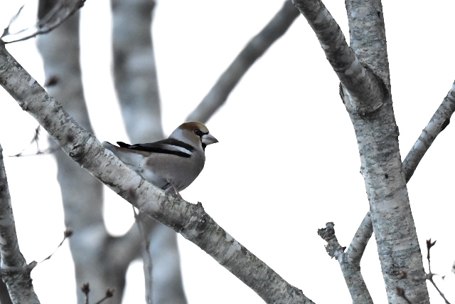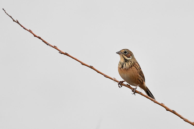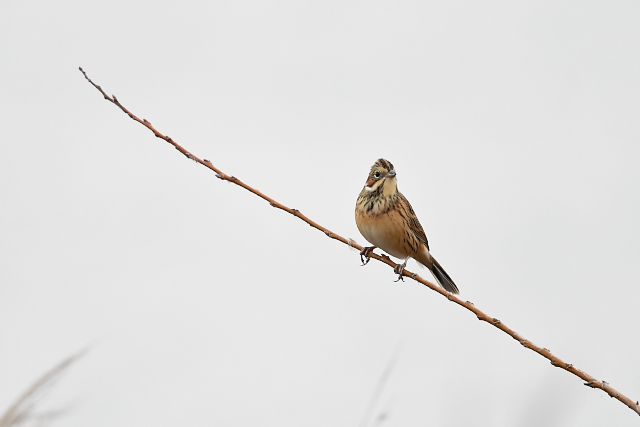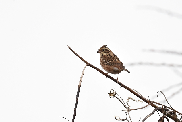 灌木の枝にホオアカを発見。枝が込み入っていたのですが、運良く抜けたところに上がってきました。 カシラダカの群れはつれなく遠くの枝に飛とんでいきましたが、1羽だけ残ってくれました。