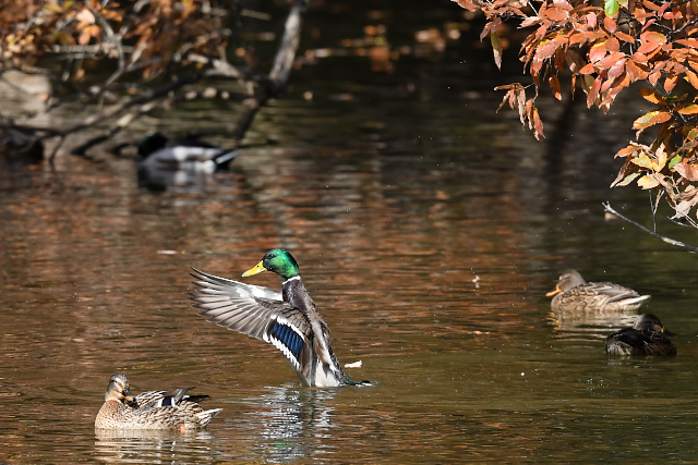 ミヤマガラスの群れにコクマルガラスが複数羽混じっていました。 木々が紅葉し、池の水面に映っていました。マガモも、光線が当たると美しい色です。 思わぬところで、ミソサザイを見ました。 |