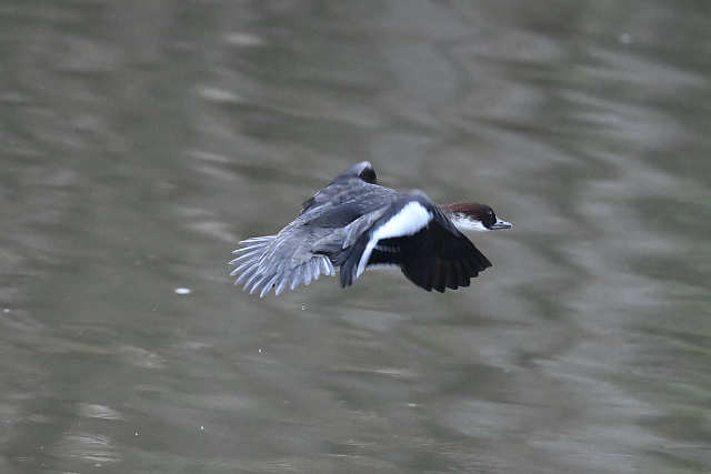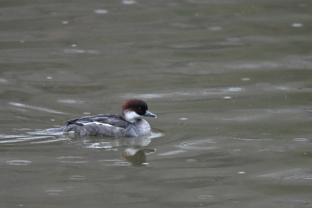 ミコアイサ雄の成鳥に出会いました。急ぐように沼縁の網に近づき、また離れて行きました。 目の色が赤くないホシハジロがいました。メジロガモとの交雑かな?