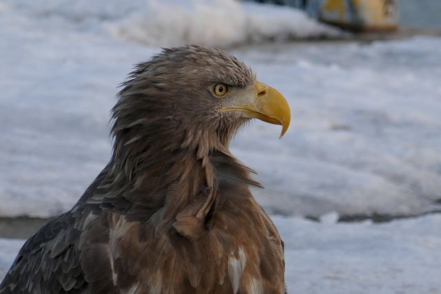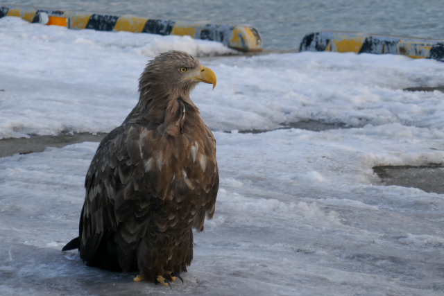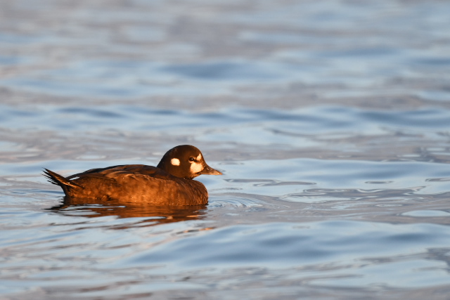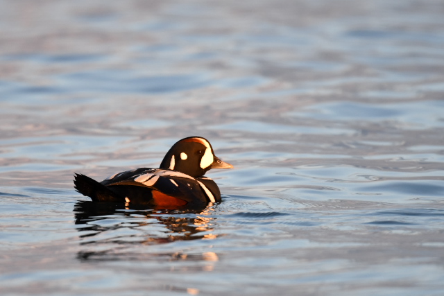 夕暮れが近い漁港、釣り人の横に佇むオジロワシを見ました。どこまでも近づけます。ついに真横まで。印旛沼のカンタ君を思い出しました。私の中にある人を寄せ付けない精悍なイメージが崩れてしまいます。しばらくじっとしていましたが、釣り人に邪険にされて去っていきました。 シノリガモが夕日を浴びて、美しい色が出ていました。