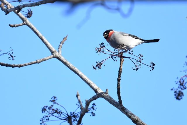田んぼの後は、公園の中や沼縁を歩いてみました。コゲラがこの実を目当てに集まってきて、しばらく楽しませてもらいました。 薄暗いところではルリビタキやメジロ、沼べりではアカハラ、カンムリカイツブリをみました。