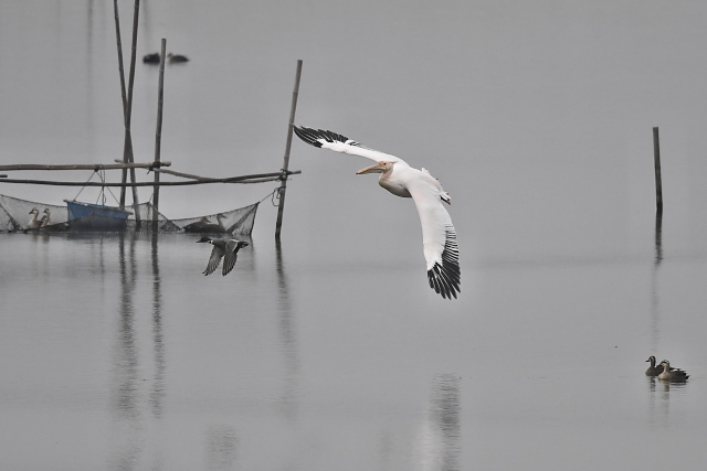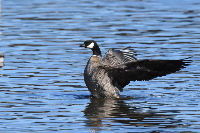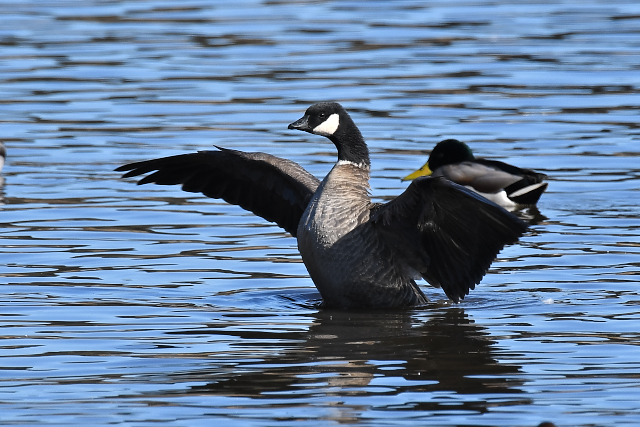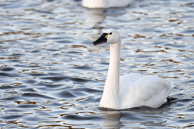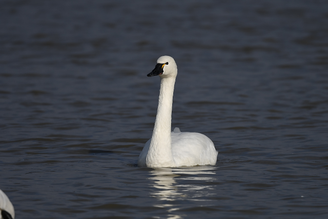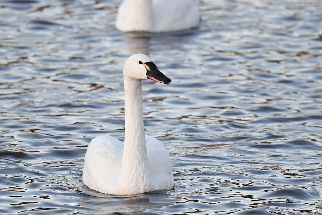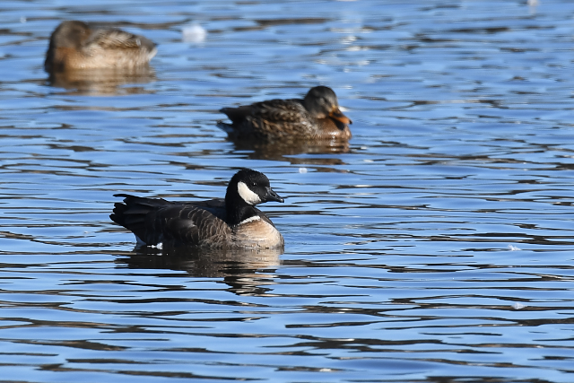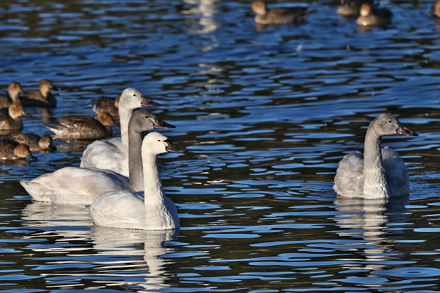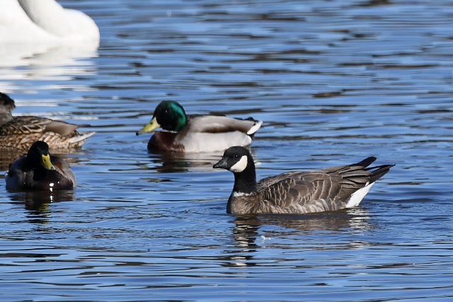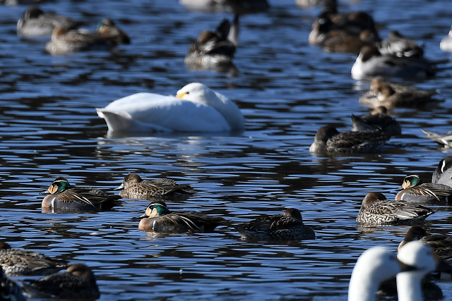 朝早く到着しました。水面を埋め尽くすようにコハクチョウ、オナガガモ、マガモ、ヒドリガモなどがたくさんいます。 双眼鏡で水面の端から端まで何度も探してみましたが、目的のトモエガモやシジュウカラガンは見つかりません。あきらめかけたとき、やってきた方が、寝ているんだよ、と教えてくれました。 時間が経つにつれて、目も慣れてカモも起き出して、ようやく探し出すことができたのでした。シジュウカラガンは以前田んぼで見ていますが、水面にいる姿は初めてでした。 |