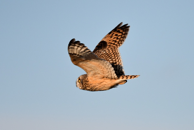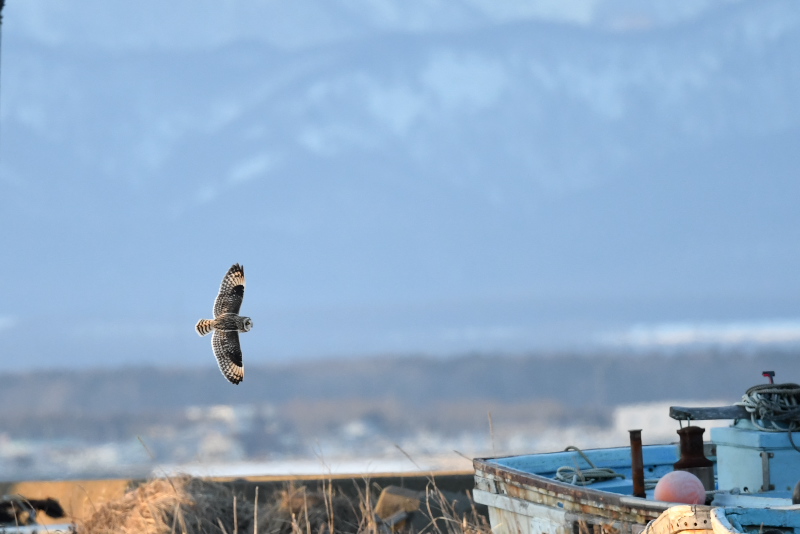 コミミズクは明るいうちからカラスに追い立てられるように飛んでいました。複数羽のコミミズクが入っているとのことです。 エゾフクロウも健在でした。朝早いうちだと顔に陰が入らないとのことですが、お昼頃になってしまいました。 漁港にはホオジロガモやスズガモ、ユリカモメ、オオセグロカモメなどとともにカワアイサもいました。カモたちはカモメに餌を横取りされながらも、せっせと餌取りをしていました。 |