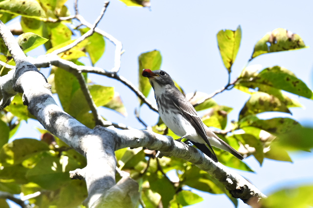 地元でエゾビタキに出会うことができました。この秋は一度も見ていなかったので、うれしい出会いでした。3羽を見ました。カに刺されながらも、時間を忘れてシャッターを切りました。