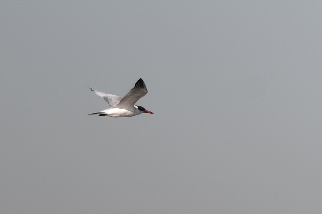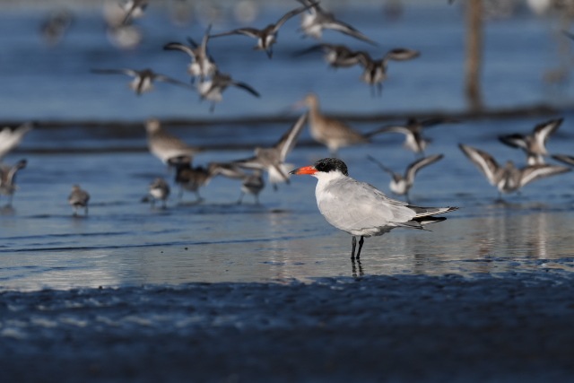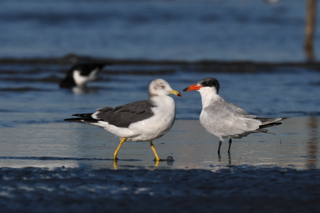 三番瀬に到着すると、オニアジサシは観察する人たちからごく近いところにいて、そこに参加させてもらいました。 以前、葛西臨海公園で見たオニアジサシは、赤いくちばしの色がわかる程度のはるかかなたの距離だったので、今回は夢のような近さでした。 落ち着いて羽づくろいをしていました。大きさは、周りのウミネコと比べてもそう違わない大きさだったので、やはり大きいのでしょう。