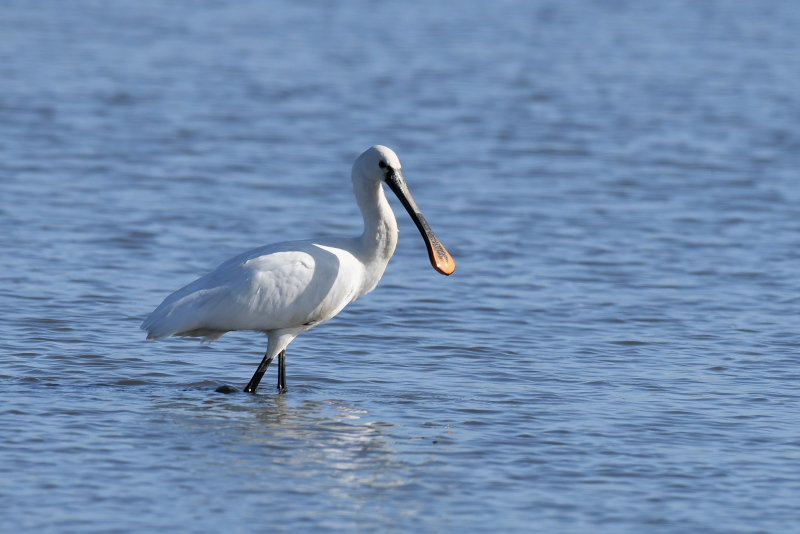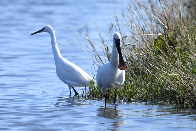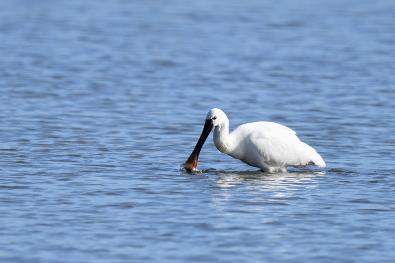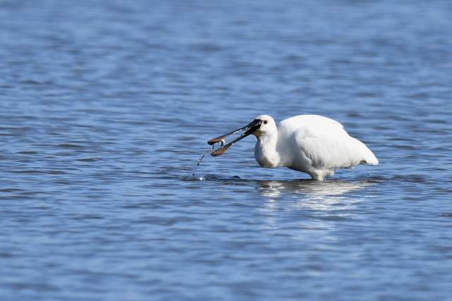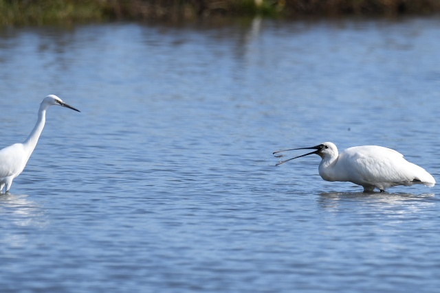 空腹を満たすように、嘴を左右に振り回して採餌し始めました。サギがおこぼれを狙っているようでした。
