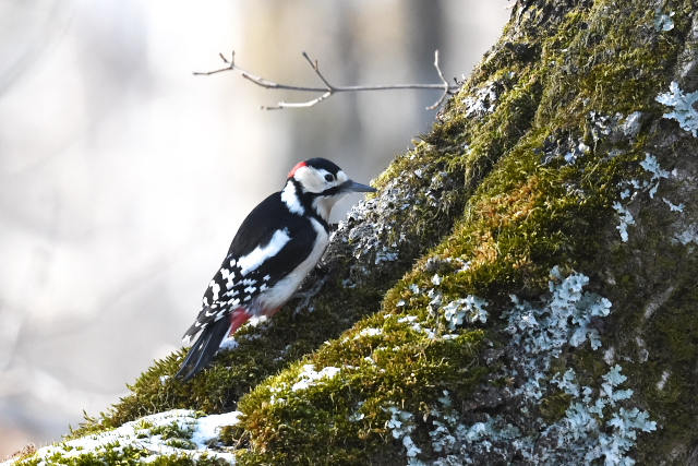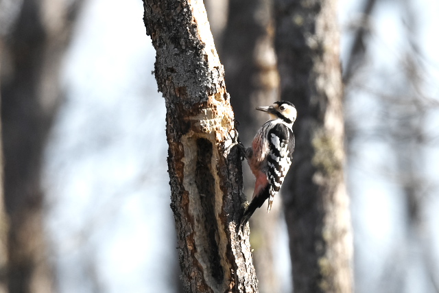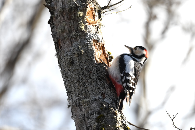 オオアカゲラは、アカゲラが同じ場所にとどまる時間が短かったのに対して、見ている間ずっと同じ木にとどまって木をつついていました。北海道では初めてだったので、うれしい出会いでした。
