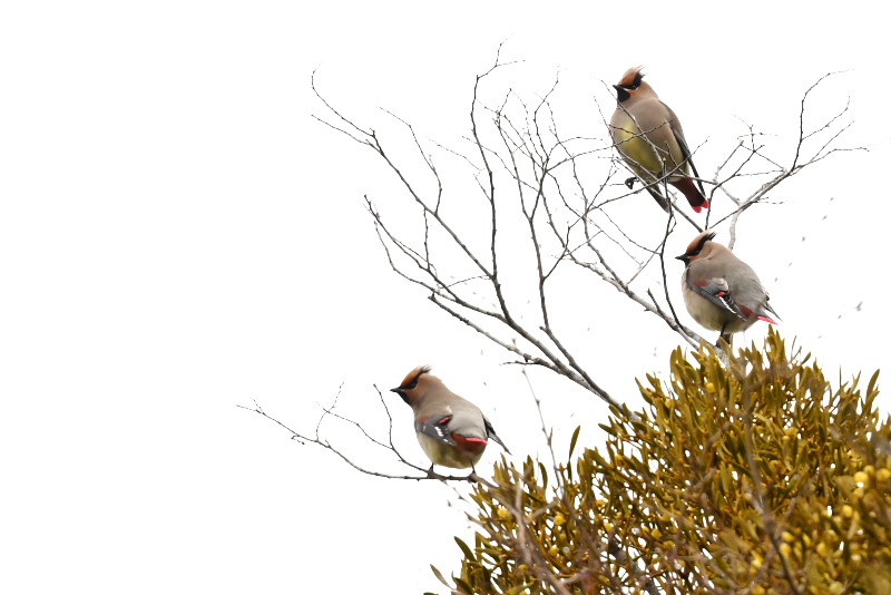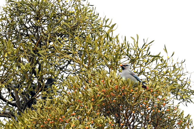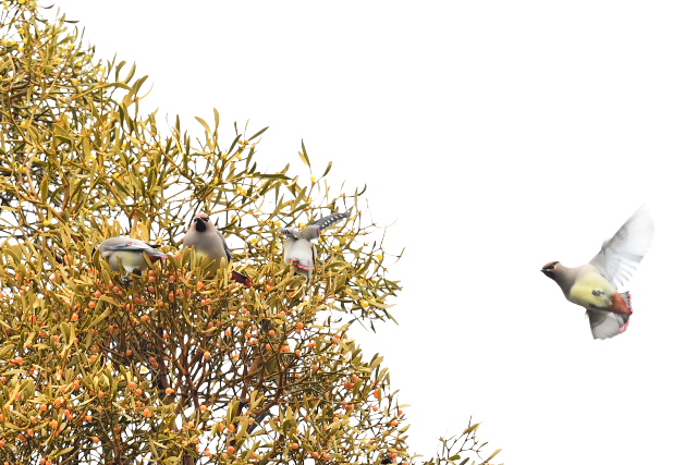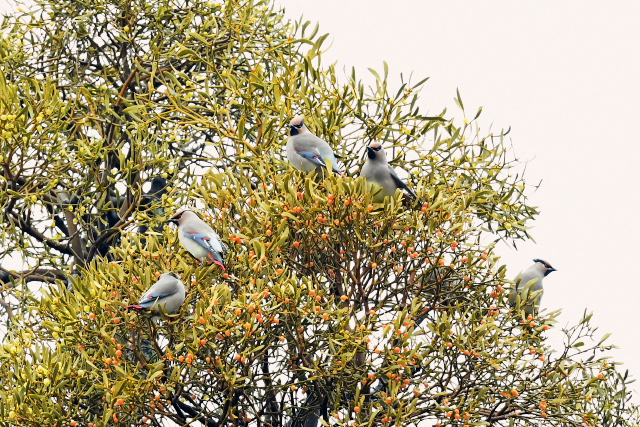 当たりをつけた木にレンジャクらしき1羽がやってきました。少しすると、今度は10羽程度の群れが、頭上を越えて後方のヤドリギに止まりました。 決して近くはなかったのですが、久しぶりの出会いがうれしかった。画像を見たら最初の1羽はキレンジャクでした。