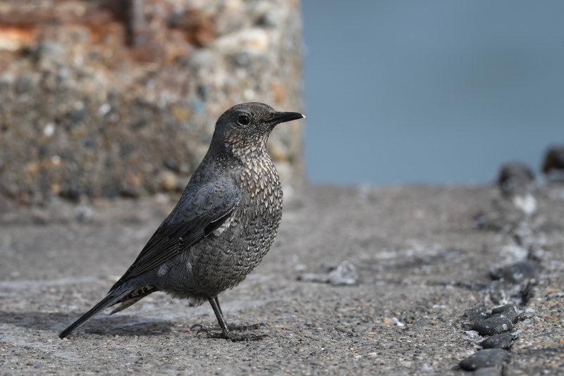 イソヒヨドリが、釣りをしている人の近くに現れました。 白色のカモメはシロカモメでしょう。