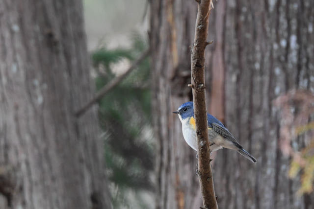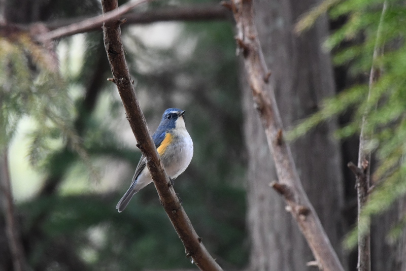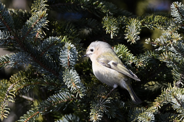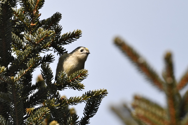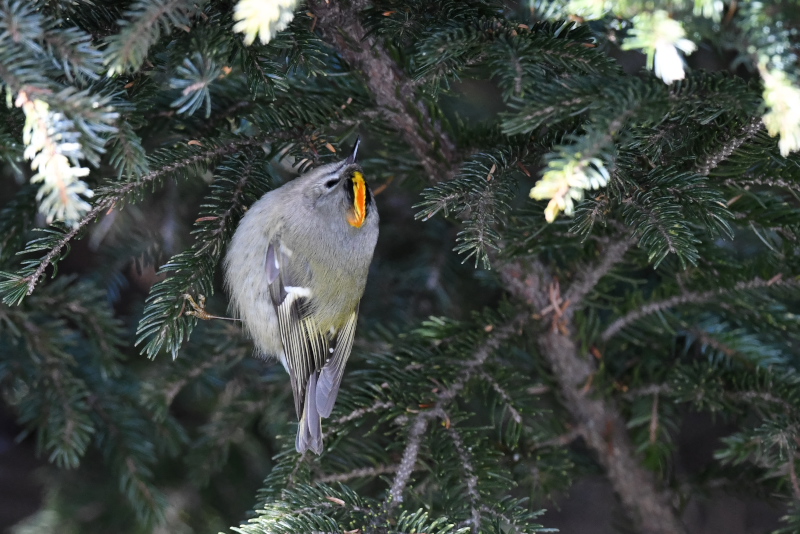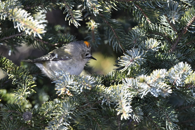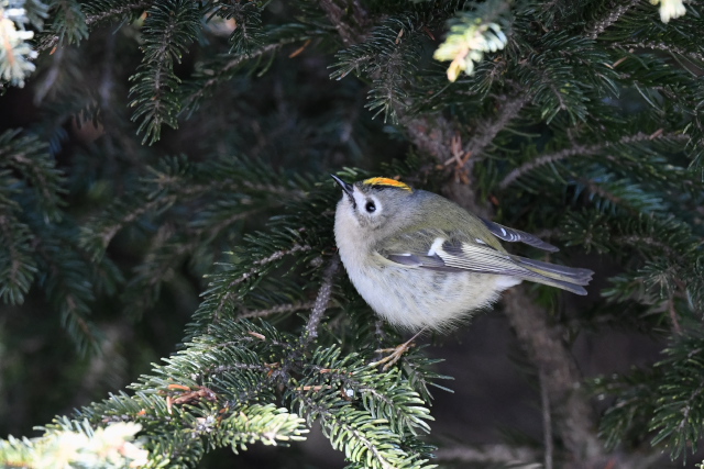 針葉樹の葉の中にオレンジ色が目立っていました。思い通りに姿を見せてくれないのですが、確認できるあいだは粘ってみました。頭頂の黄色い線の中に橙色線があるのは雄なのでじょう。