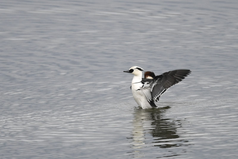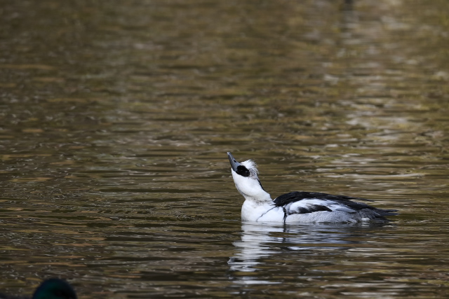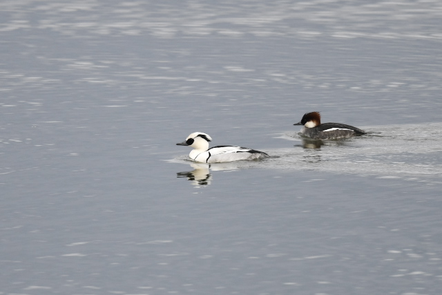 ミコアイサの雄は警戒心が強いようです。雌とともに近づくのですが、途中からぴたりと止まって雌だけになります。白色というのは明るいためか、華やかに感じますね。