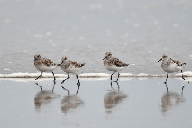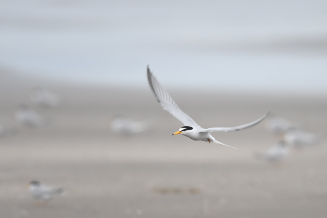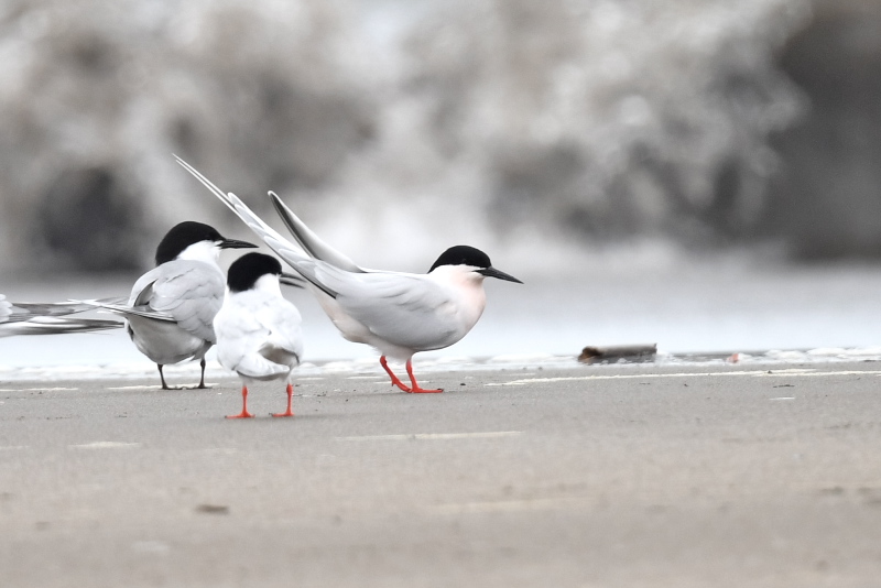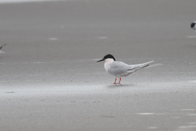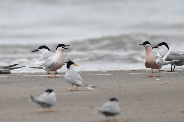 アジサシやコアジサシの中で、ピンク色の胸が目立ってとてもきれいでした。 よく見ると、胸のピンクが少し薄いベニアジサシがもう一羽いて合計2羽でした。 ときどき飛んでもとの場所に戻ったり、2羽でディスプレイをしていて、楽しませてもらいました。 ベニアジサシは昨年初めて見たのですが、今年も出会えるなんて幸運でした。