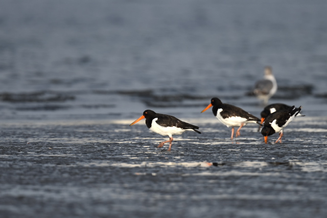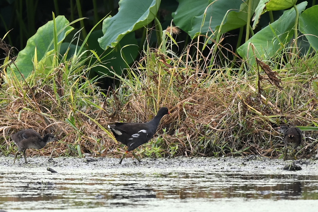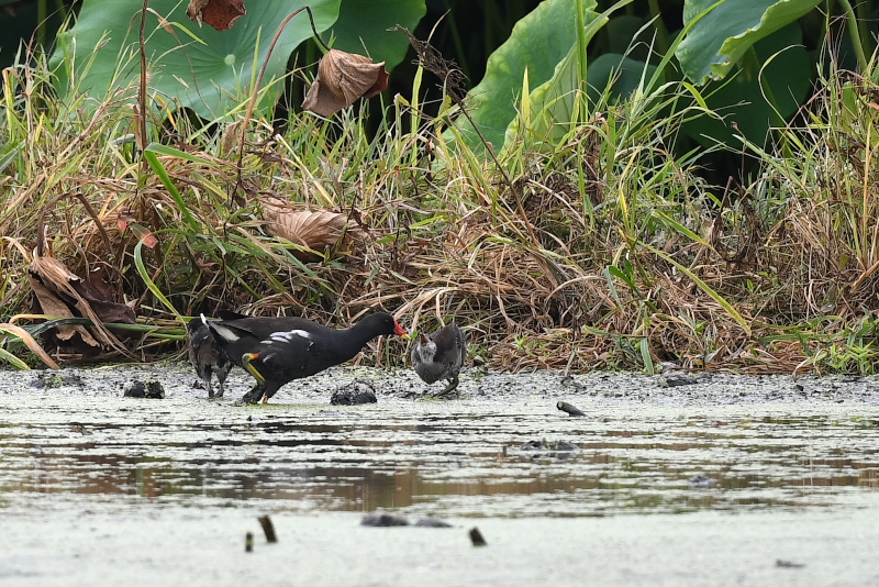 タカブシギは10羽かそれ以上の数を見ました。他のシギ、チドリに比べて数が一番多かった。 バンの親子が突然現れて、シギ・チドリを見ているところを横切るように通っていきました。親に餌をねだっているように見えます。 |