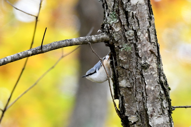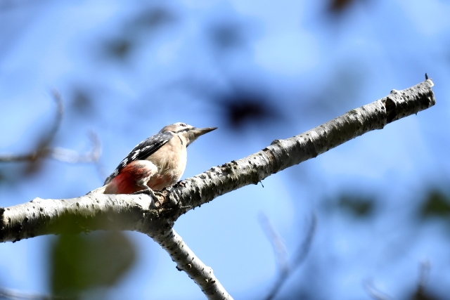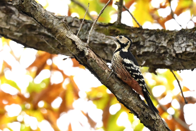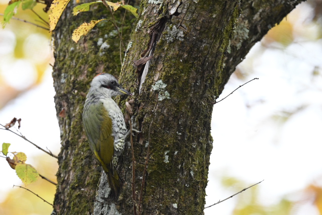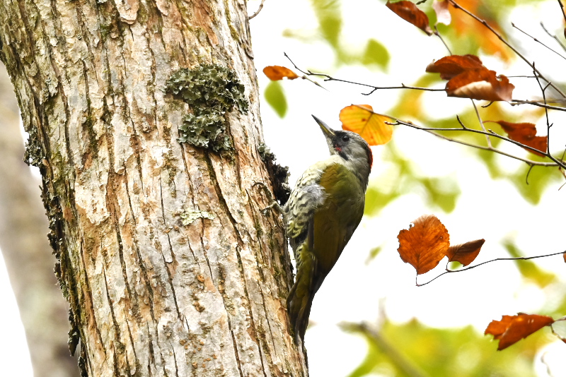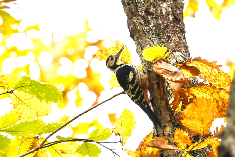 コンコンとするドラミングの音を粘り強く追ってみると、オオアカゲラでした。同じところにはアオゲラも姿を見せ、長い舌を伸ばして木の皮の間から一所懸命に餌をとっていました。