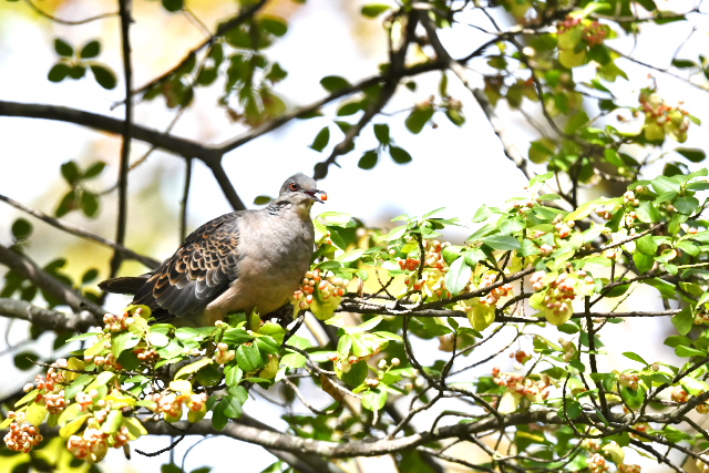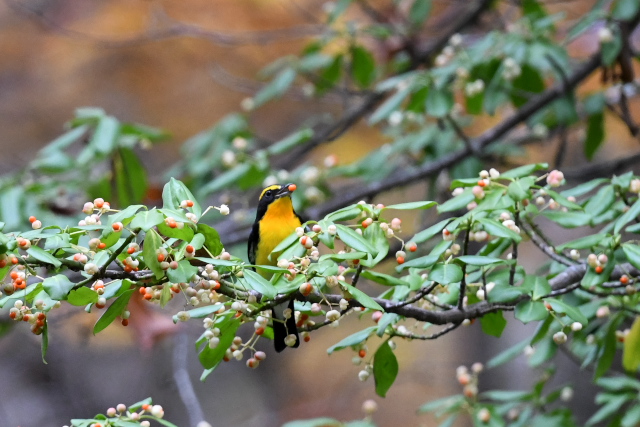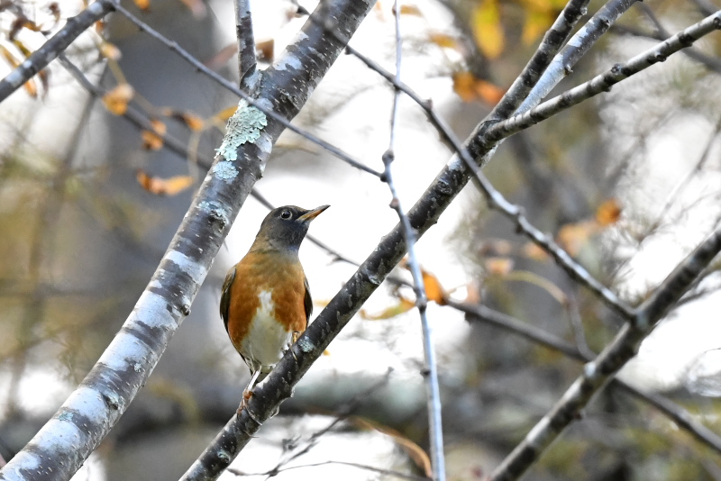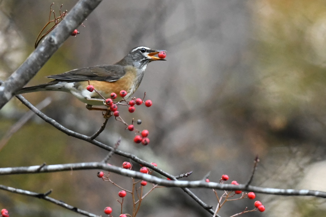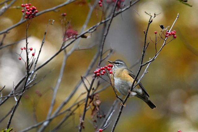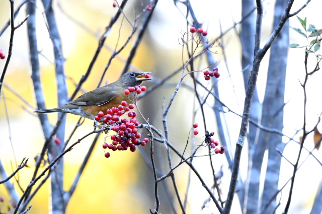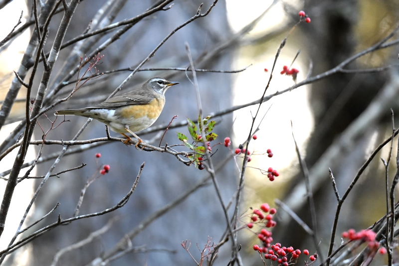 ナナカマドの実にはマミチャジナイとアカハラがきていました。ヒタキ類のような派手なホバリングなどは無く、気がつくと枝に止まって実を食べていました。