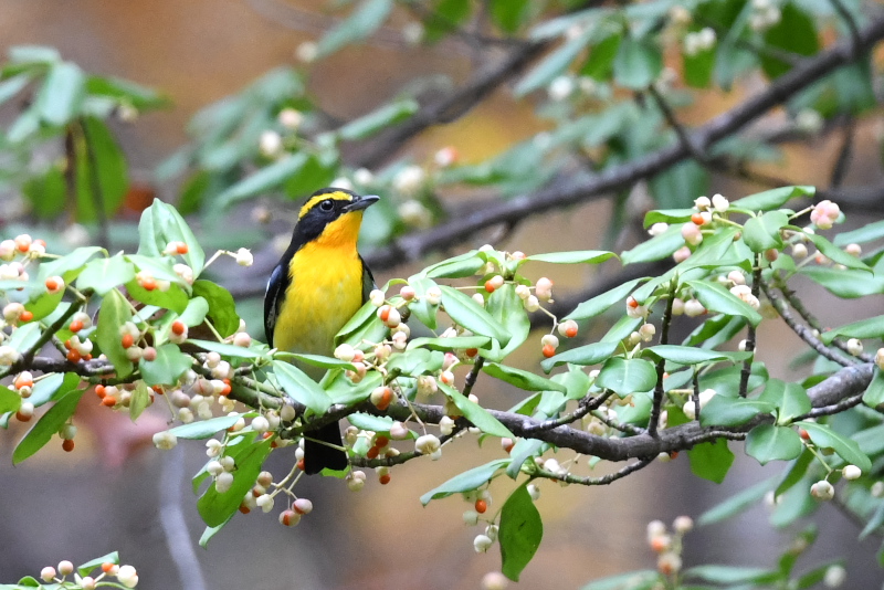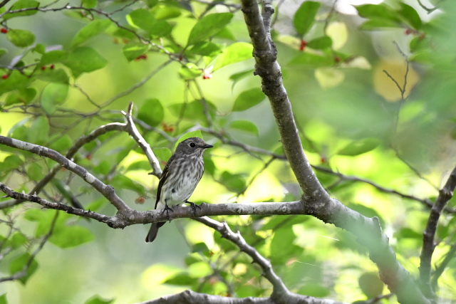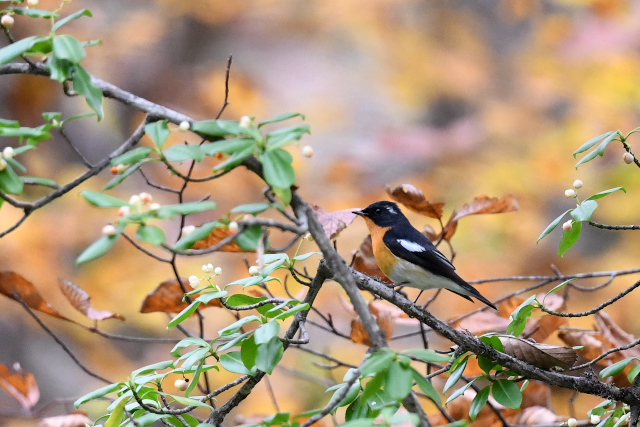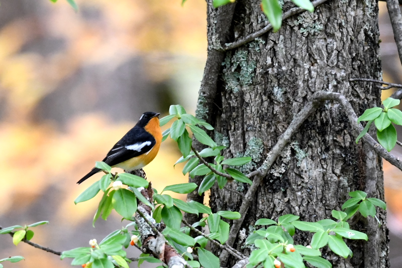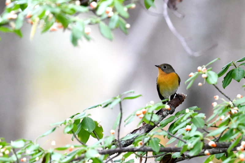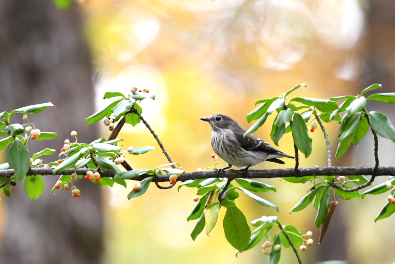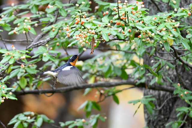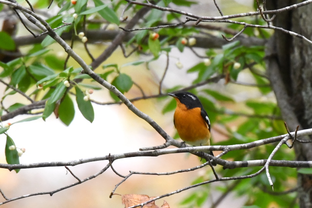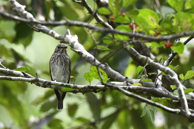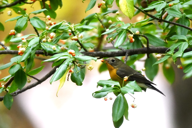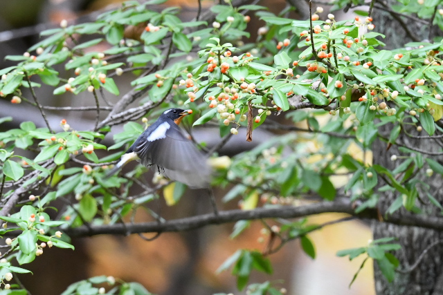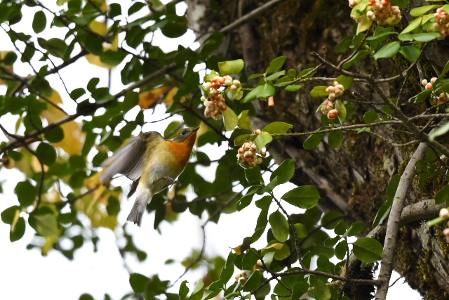 サメビタキは9/30に見ていますが、まだいました。 エゾビタキの姿もまだあります。赤い実のところにやってきますが、めったに口にしないようです。 |