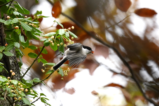 ツルマサキの実をホバリングしながらとって、さっと持って行きます。