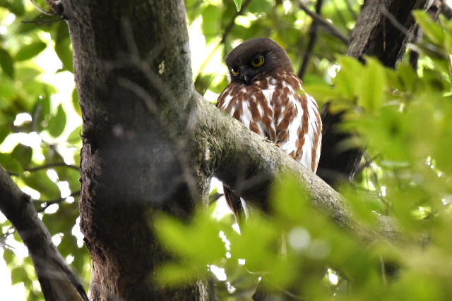 諦めて帰ろうかな、と思ったときにホッホウ、ホッホウという声が聞こえたので気を取り直して探しました。 うろうろして角度を変えてみたのですが、見えたのは一方向のみでした。