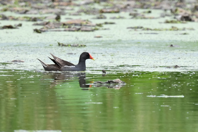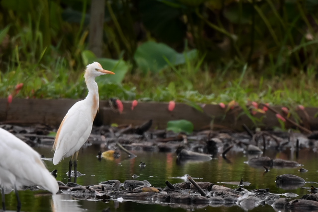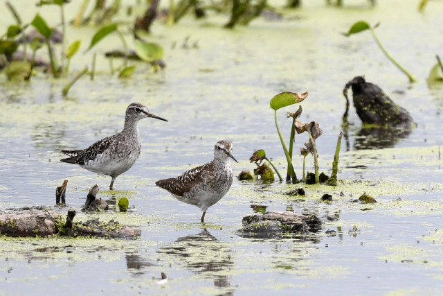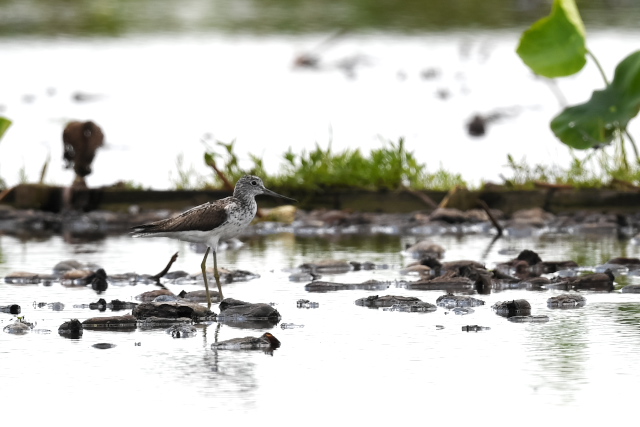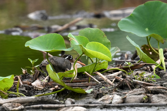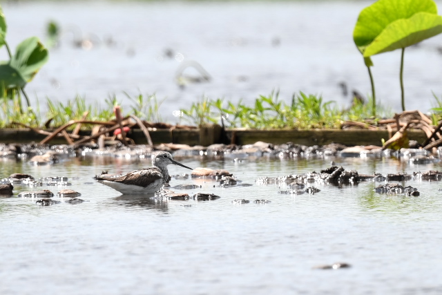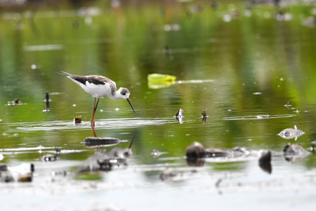 サギが集まっている蓮田にオグロシギ、コアオアシシギが1羽ずつとセイタカシギが2羽いました。 バンの幼鳥が親に近づいて餌をねだりましたが、もう与えてはもらえないほどおおきくなっているようです。