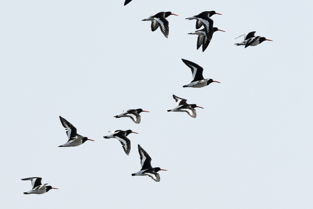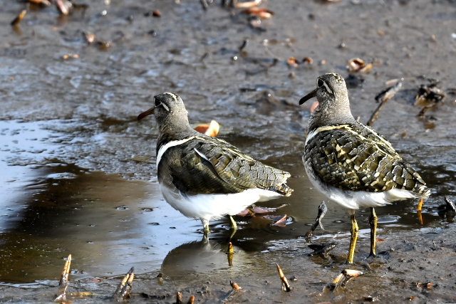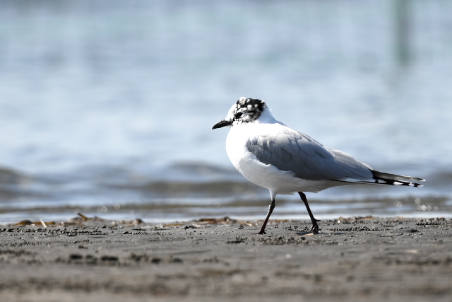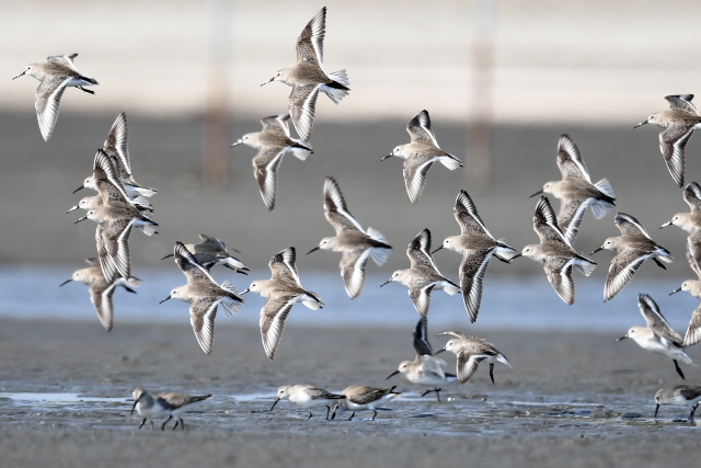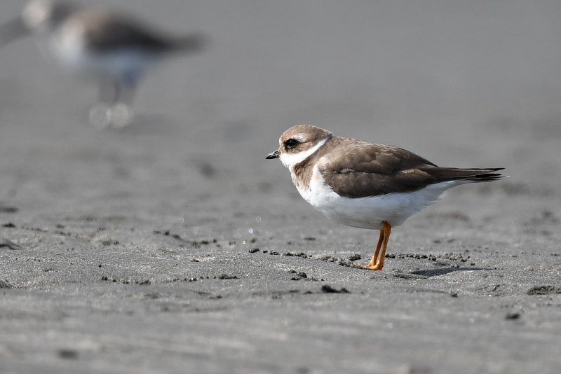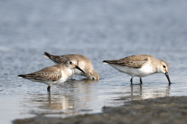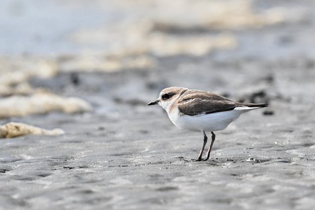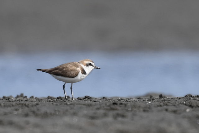 引き潮から満ち潮に変わって間もない時間帯で、干潟は大きく広がっていました。 鳥の姿がないように見えましたが、汀線に向かって歩くと2〜3羽のシロチドリが干潟を歩き、ときおりハマシギの群れやミヤコドリの群れが飛びました。 シロチドリに混じって、脚の色がオレンジ色に目立つハジロコチドリに出会えたのがうれしかった。