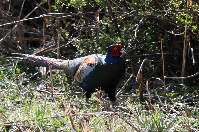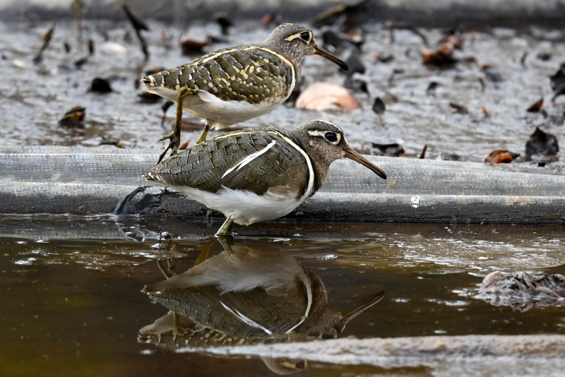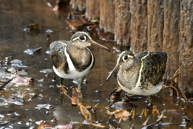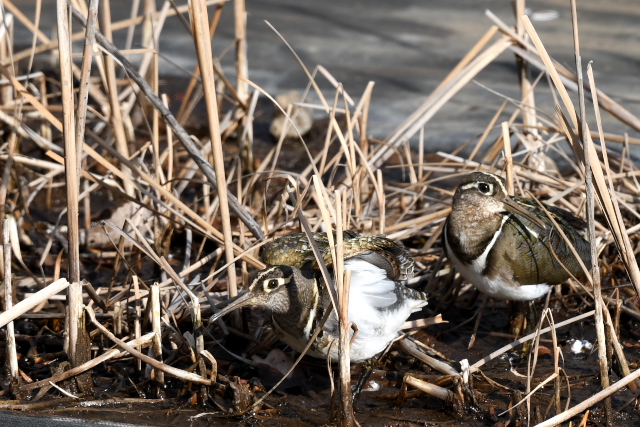 枯れ草の茂みの中でしばらく休んでその後、周りの水たまりのある地面から餌を探すことを繰り返していました。 タマシギをこんなにもじっくりと見ることができたのは初めてのことでした。 |
