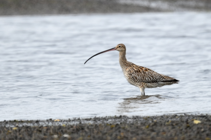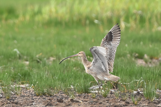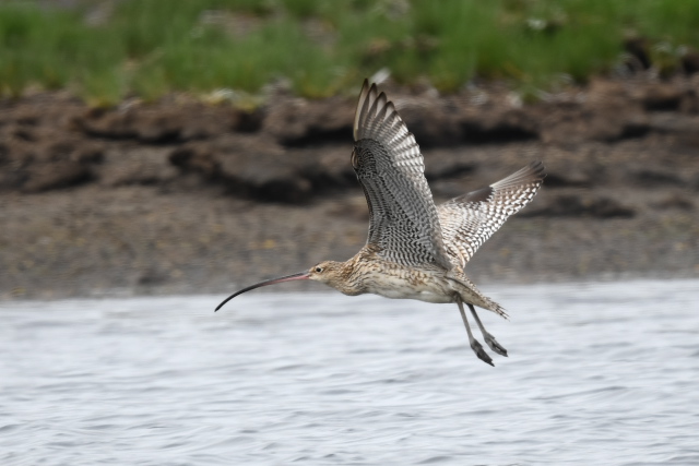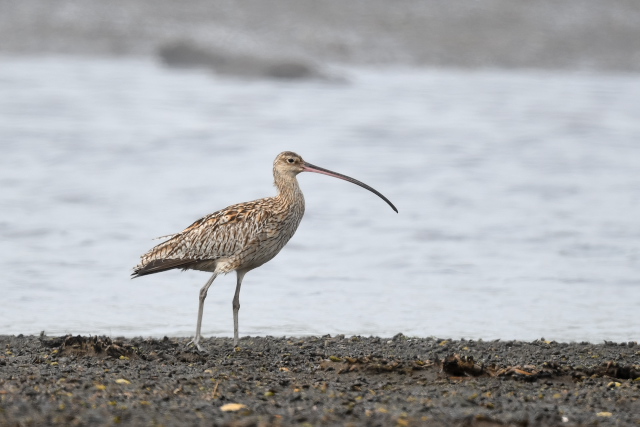 野付半島の水辺ではアオサギを多数目にしますが、それとは違う小さめの鳥の姿がありました。ホウロクシギでした。