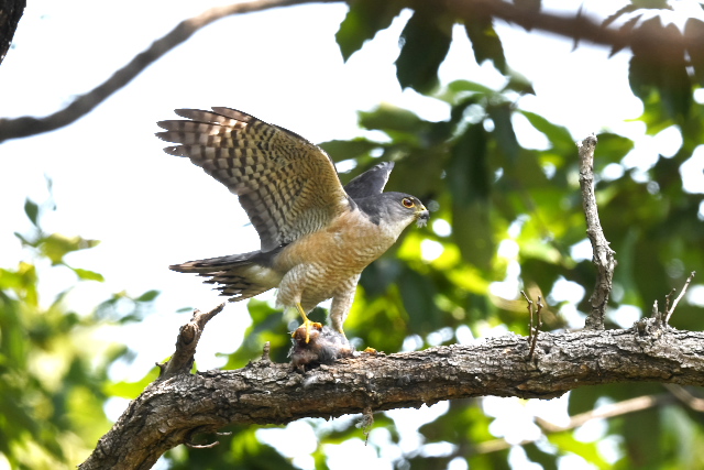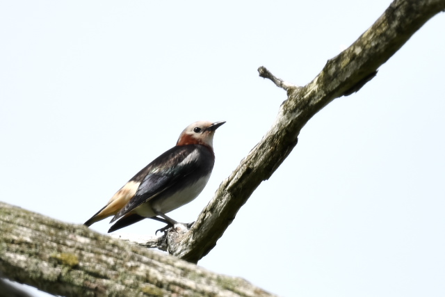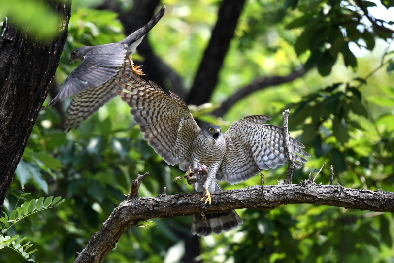 巣立ち前に訪ねたときは、雄が餌をなかなか運んで来ないので雄を見ることができませんでしたが、今日は運良く餌渡しの場面を見ることができました。 それぞれ離れた場所にいて数は確認はできませんでしたが、5羽が巣立ちしていると聞きました。 |