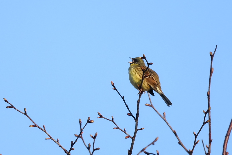 早朝散歩です。アオジは道の脇のあちらこちらにいて、さえずりもひっきりなしに聞こえてきました。とても気持ちのいいものです。