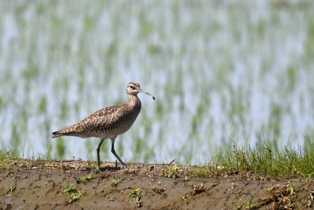 チュウシャクシギは10羽前後の群れでした。近くでは田植えの機械が動いていましたが、落ち着いて羽を休めていました。