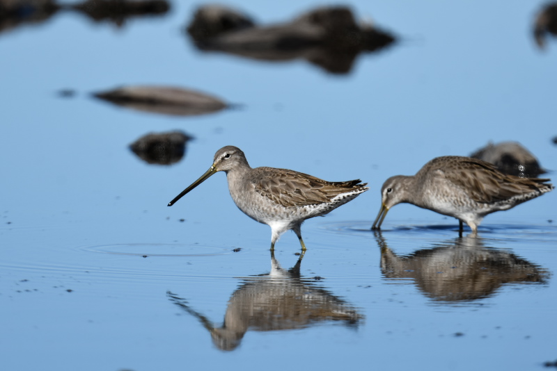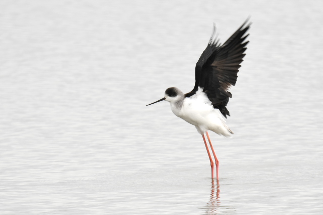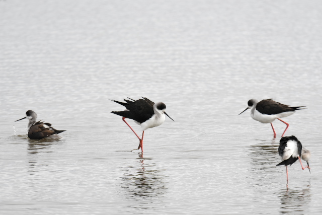 シロハラ、アカハラは写しやすくなってきました。 4羽のセイタカシギが道路脇の蓮田で水浴びをしていました。