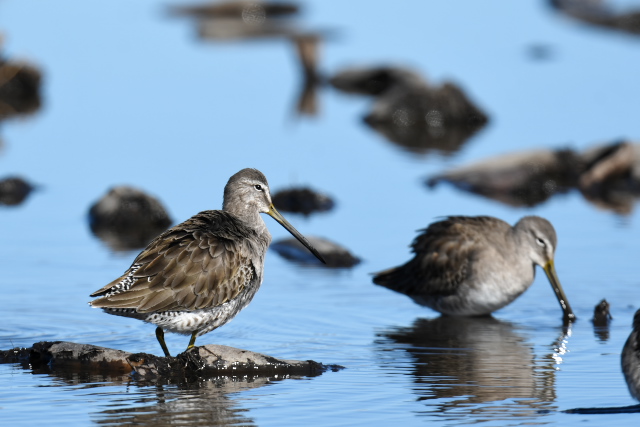 朝の内は氷が張ってオオハシシギの姿が見えませんでしたが、時間をおいて再び訪ねると、30羽ぐらいのオオハシシギが集まっていました。 バンは1羽でした、出会えるとうれしい鳥になっています。