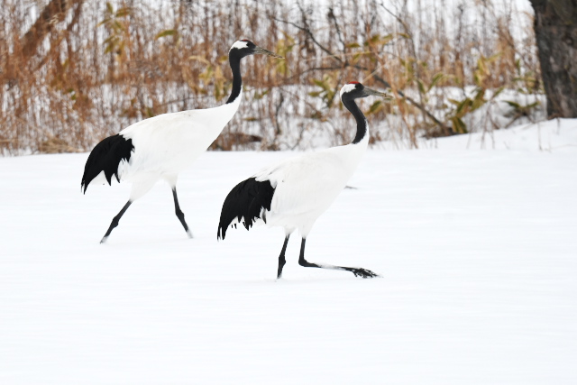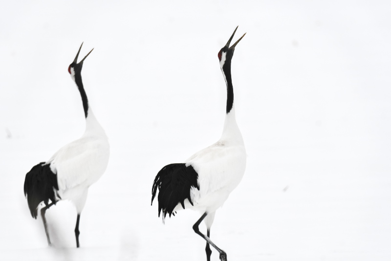 2羽のタンチョウが雪原に降り立ち、鳴き始めました。