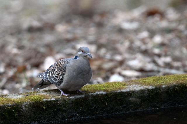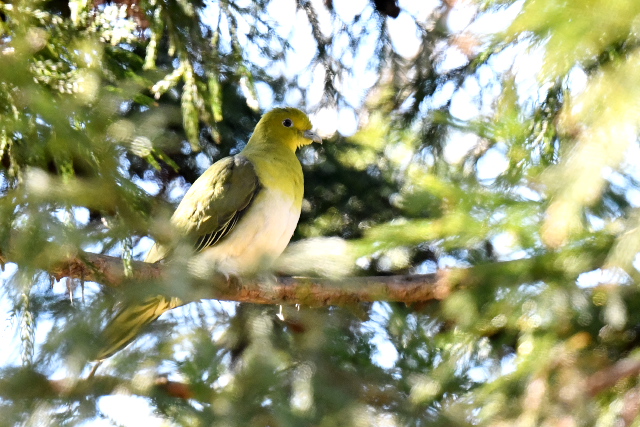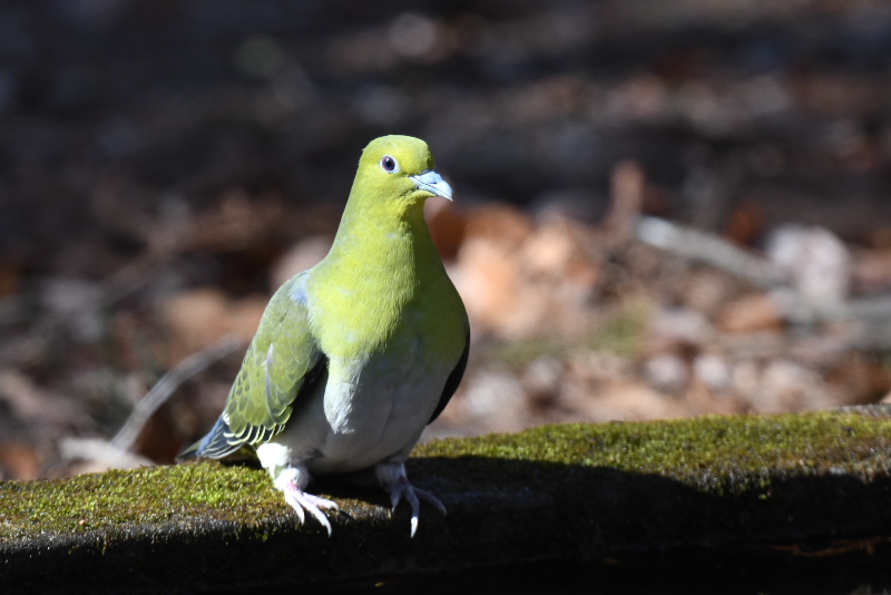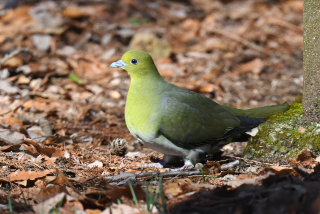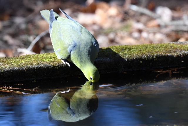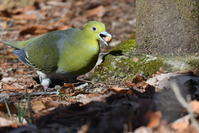 アオバトはゆっくりと水を飲み、短時間でドングリを食べて飛んでいきました。