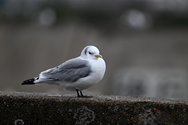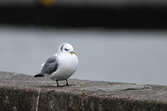 雨が降ったりやんだりの天気でした。水路の護岸に止る1羽のミツユビカモメを見ました。