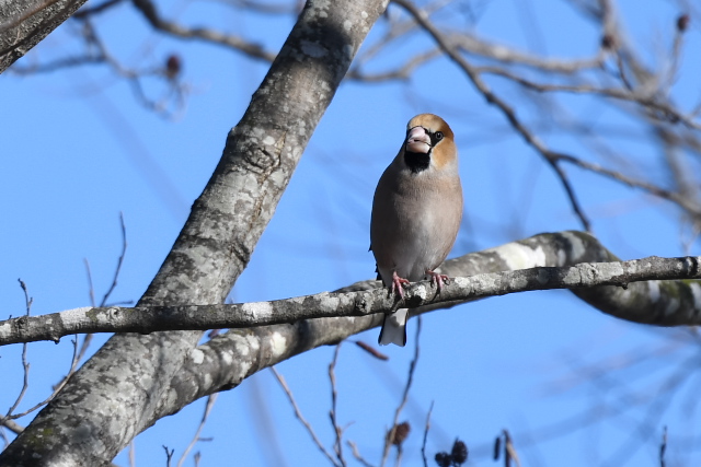 カワラヒワの小さな群れが、運良くシャッターをきるまで枝に止っていてくれました。