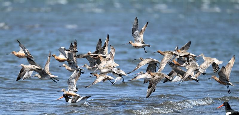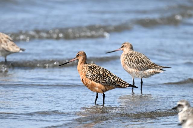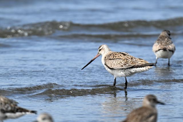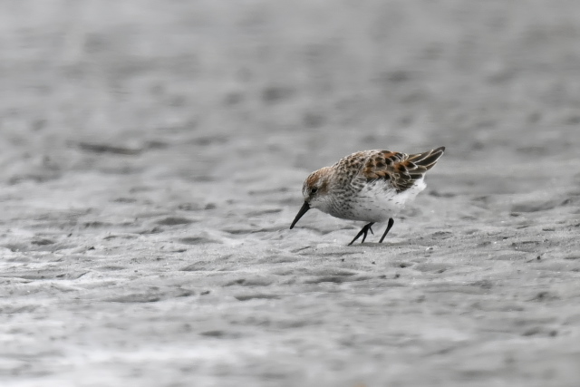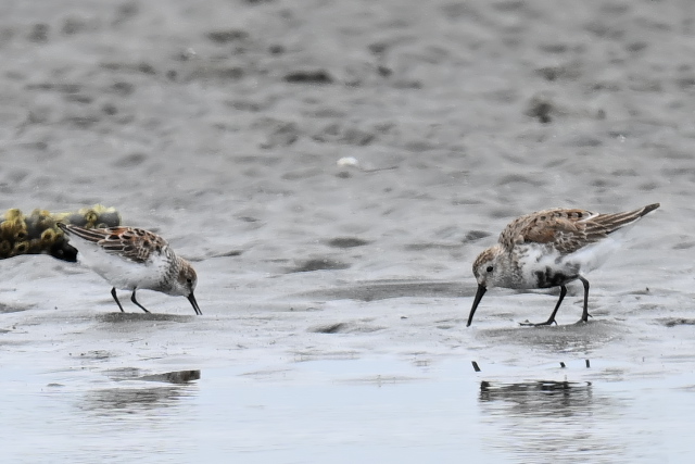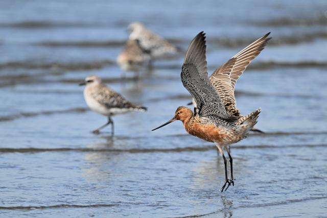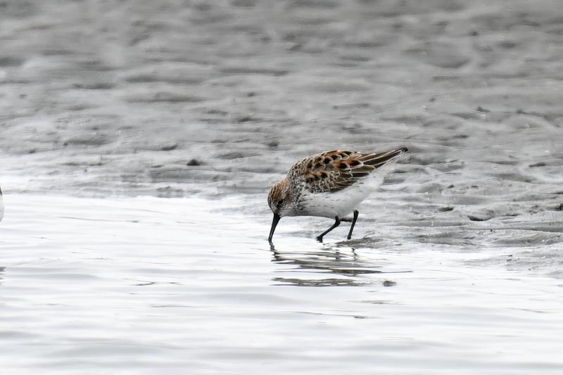ハマシギやミユビシギなどの群れの中から探し出すのは大変です。このときは、私も含め大勢の大人たちが見ていましたが、小学5年生の少年が見つけてくれました。ありがとう。 ハマシギと比べるとやはり小さいです。図鑑には小さな蹼(みずかき)があるとありますが、写真でそれらしいのが確認できました。 オオソリハシシギの夏羽、きれいでした。