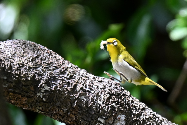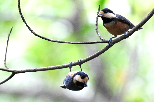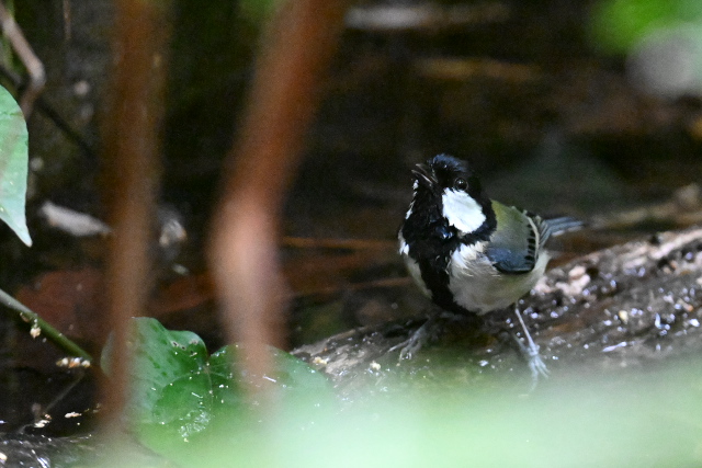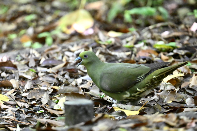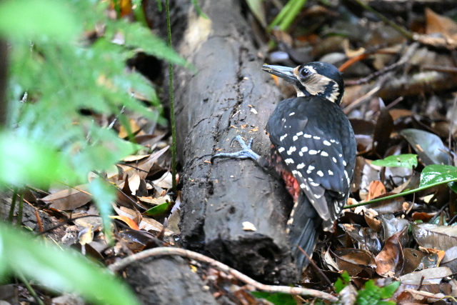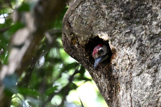 オーストンオオアカゲラは森の入り口で巣作りの最中でした。雄雌が入れ替わり立ち替わり巣穴に入って木くずを外に出していました。周辺で採食する姿も見ることができました。