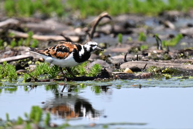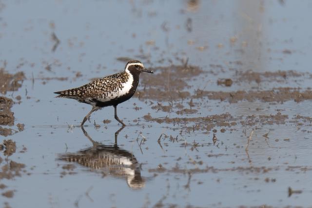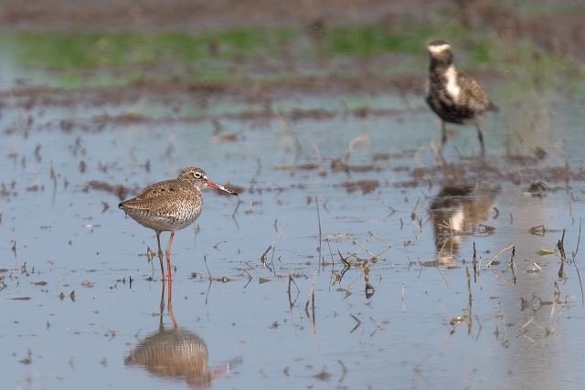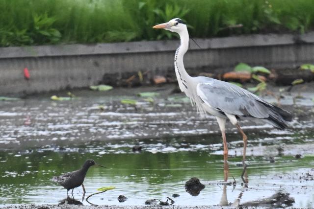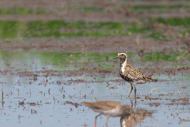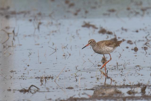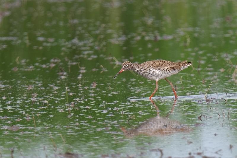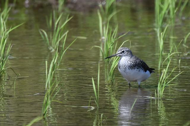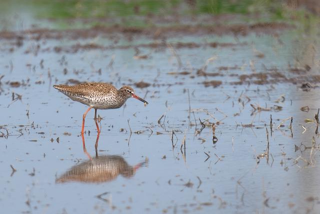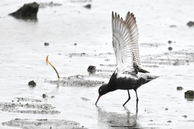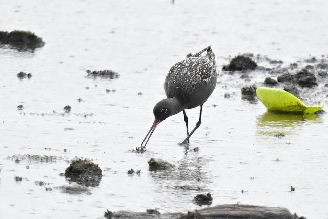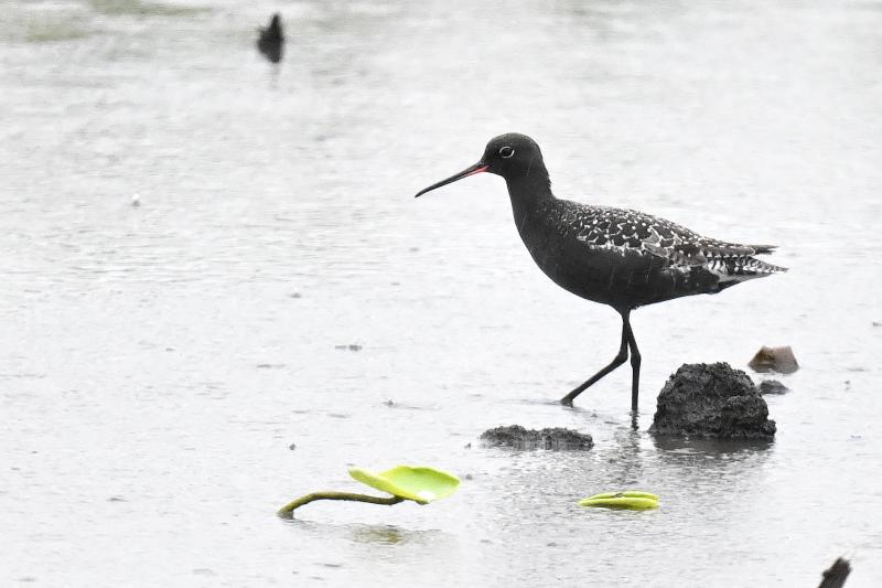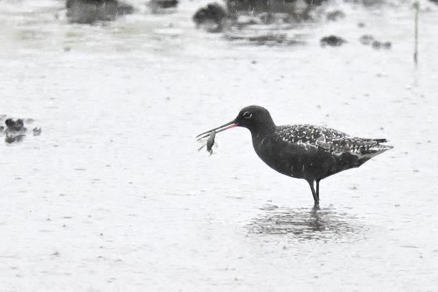 夏羽のツルシギを初めて見ました。 2羽と聞いていましたが、このときは1羽のみ見ました。採食しながらときどき羽を広げる動作を見せました。翼下面は黒ではなく白色で、目の周りの白色と共に印象的でした。