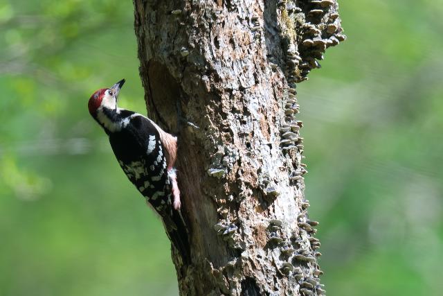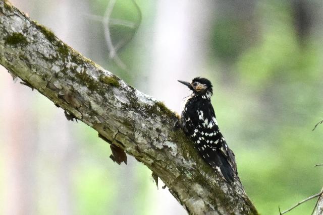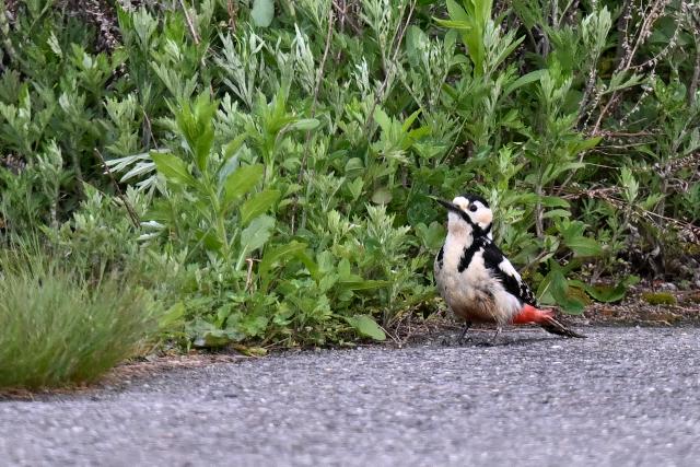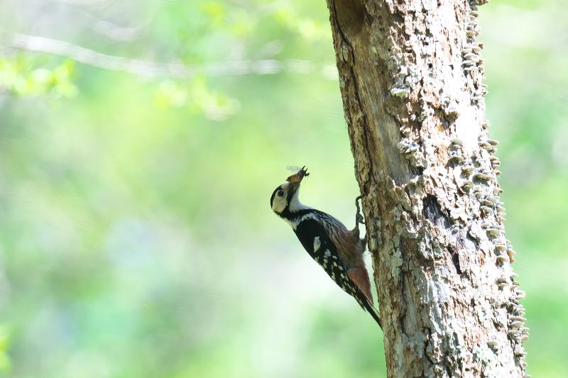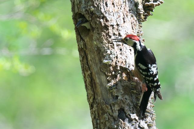 オオアカゲラは親鳥が雛に餌を与える場面に出会いました。巣穴から雛の顔も見えました。