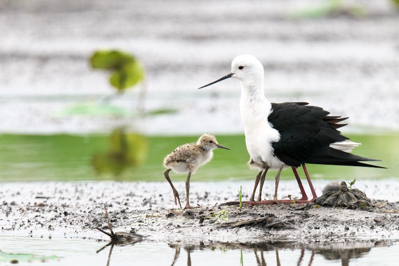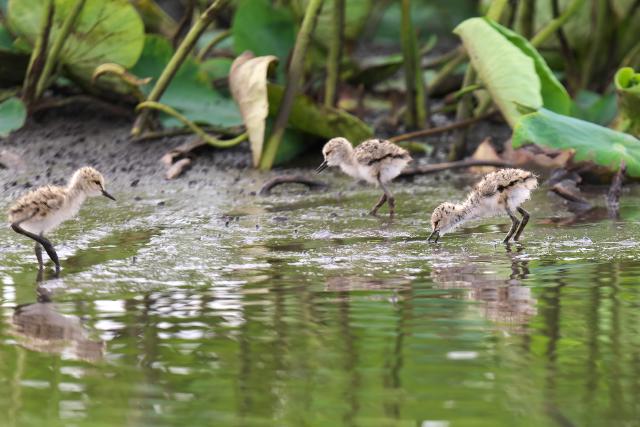 雛が親鳥のお腹の下から出てきて餌取りをしてまた戻って休むことを繰り返していました。数つがいの雛たちがうろうろしていました。