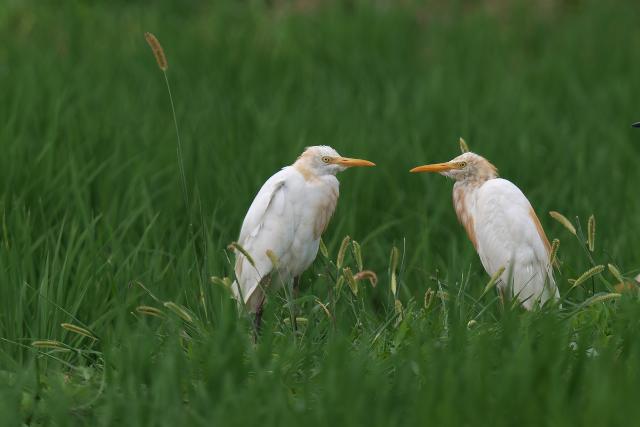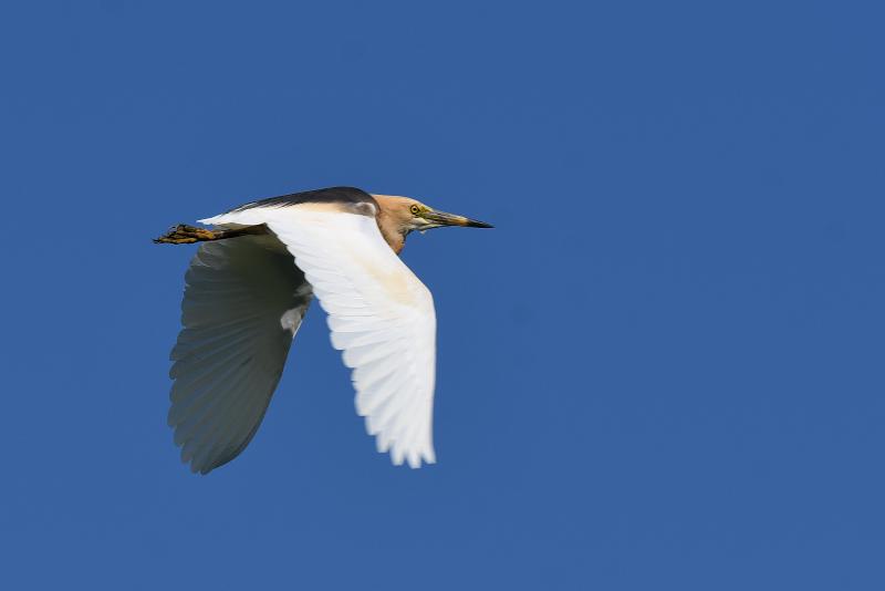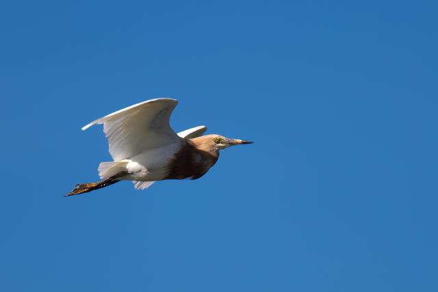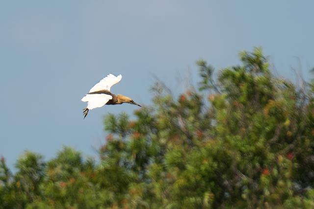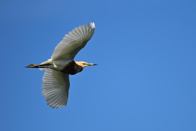 待っていると、遠くの蓮田から飛び上がって上空に姿を見せました。首周りと胸が淡い橙色だったので一瞬アマサギかと思いましたが、ジャワアカガシラサギと言う声が聞こえて、探している鳥だとわかりました。 一度は近くに降りたもののすぐに飛び上がって周辺を飛び、その後見失ってしまいました。 アカガシラサギと比べると色が薄く見えました。 |