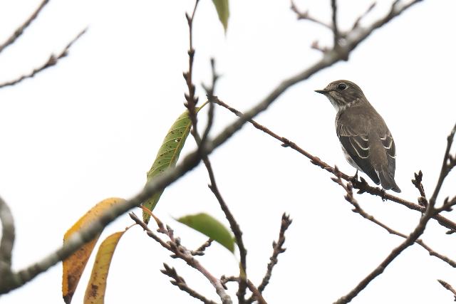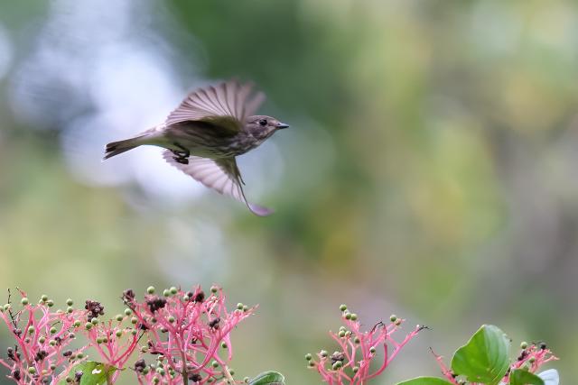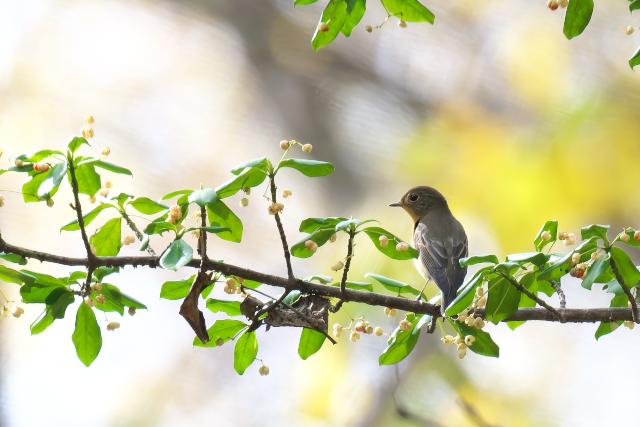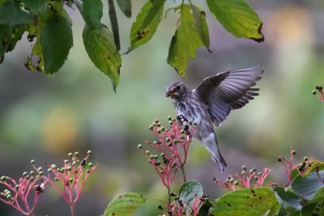 地元にエゾビタキがやってきました。10羽ぐらいがミズキの実や昆虫を狙って飛び回っていました。
