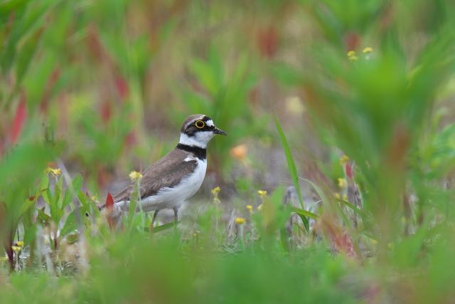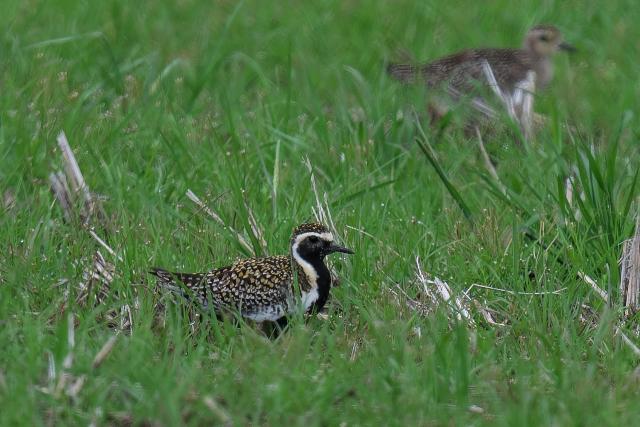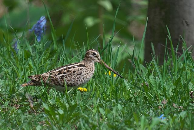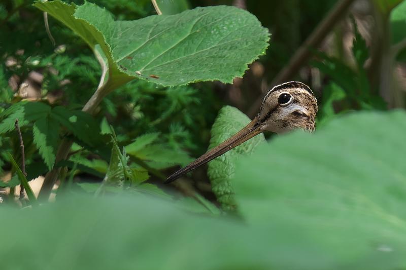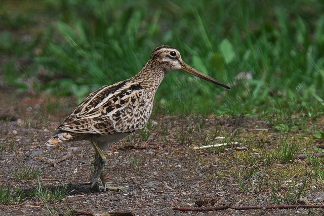 オオジシギは静かにふわっと降りてきました。ふきの葉に隠れましたが、まもなく、すたすたと道を横切って川の方に移動していきました。