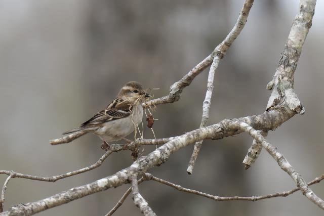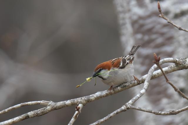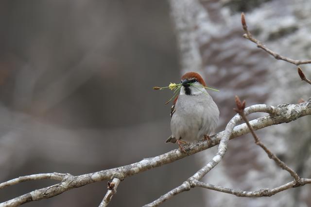 ニュウナイスズメを見ました。巣材を運んでいるようでしたが、この後アカゲラが巣穴に近づいて大騒ぎになりました。ここでニュウナイスズメに出会うのは初めてです。