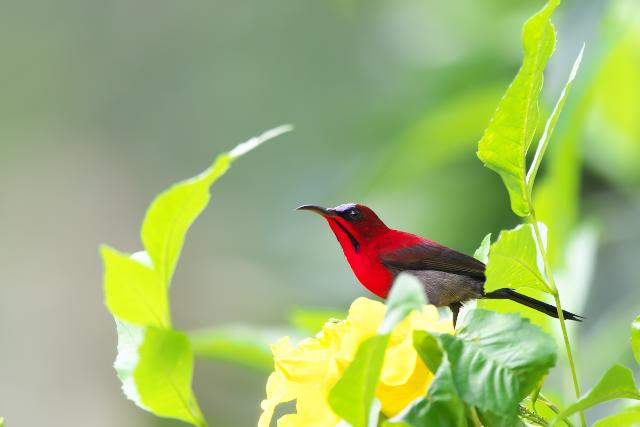 ロッカウイワイルドライフパークを見学したときのことです。 おりに入っていない赤い鳥がやってきて花に止りました。赤色が鮮やかなとても美しい鳥でした。ムナオビオウギビタキもおりの外で見た鳥です。