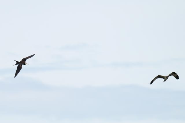 ミサゴが狩りを成功させていれば、コグンカンドリが獲物を横取りするシーンがあったかもしれません。