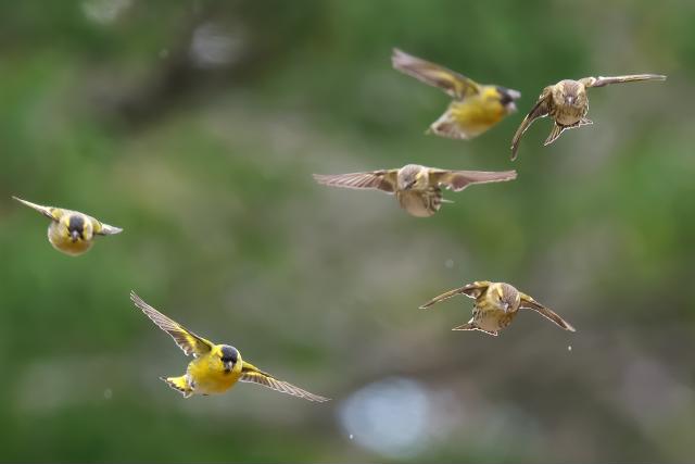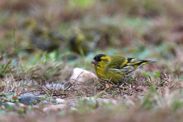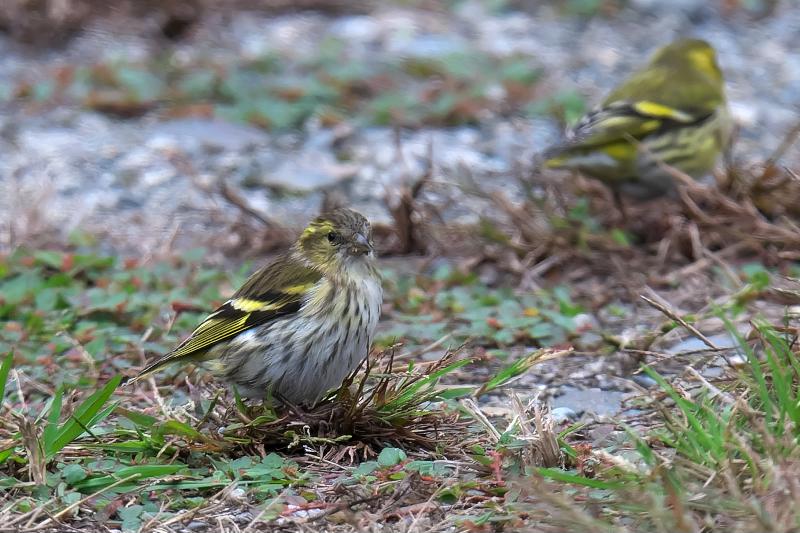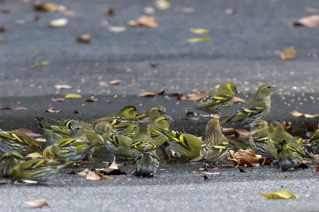 マヒワの群れは芝生で何かをついばんだ後、水たまりに降りて水を飲んでいきました。水たまりにいた時間は10秒間いたかどうかという短い時間でした。