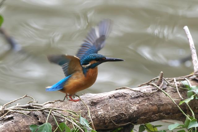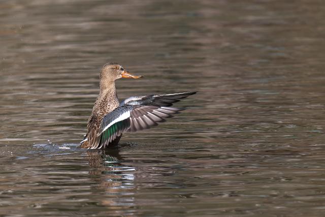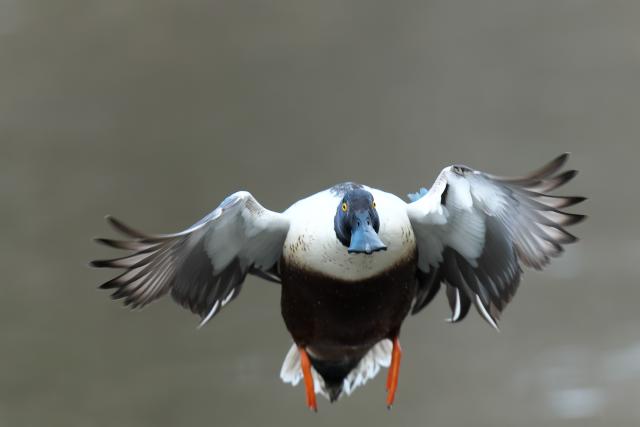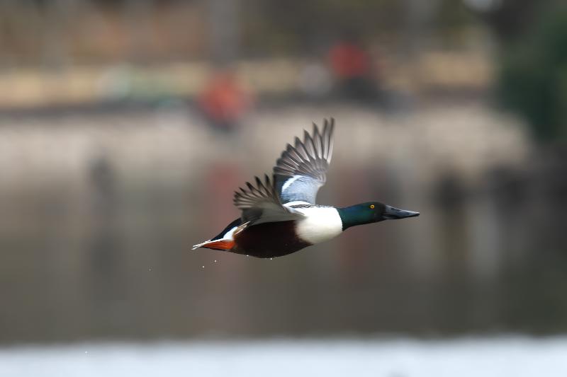 沼のカモが岸辺によってきていて、近くを飛んでいました。